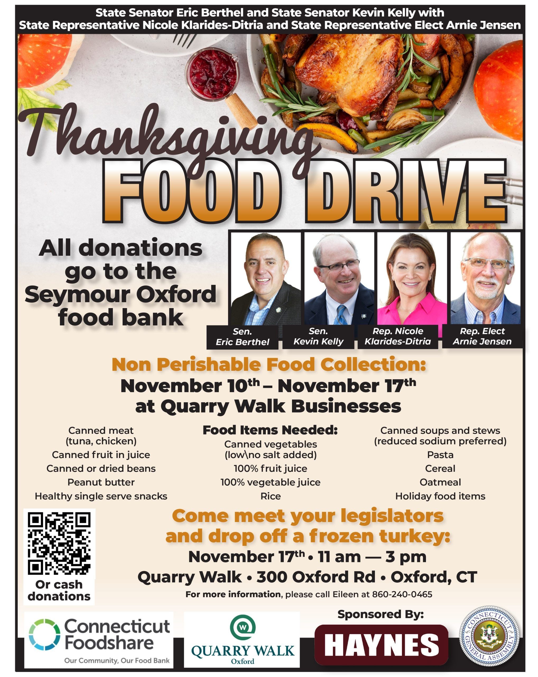 The lawmakers will also be on hand to collect donated turkeys on November 17th from 11 a.m. – 3 p.m. at Quarry Walk, 300 Oxford Rd., Oxford, CT.