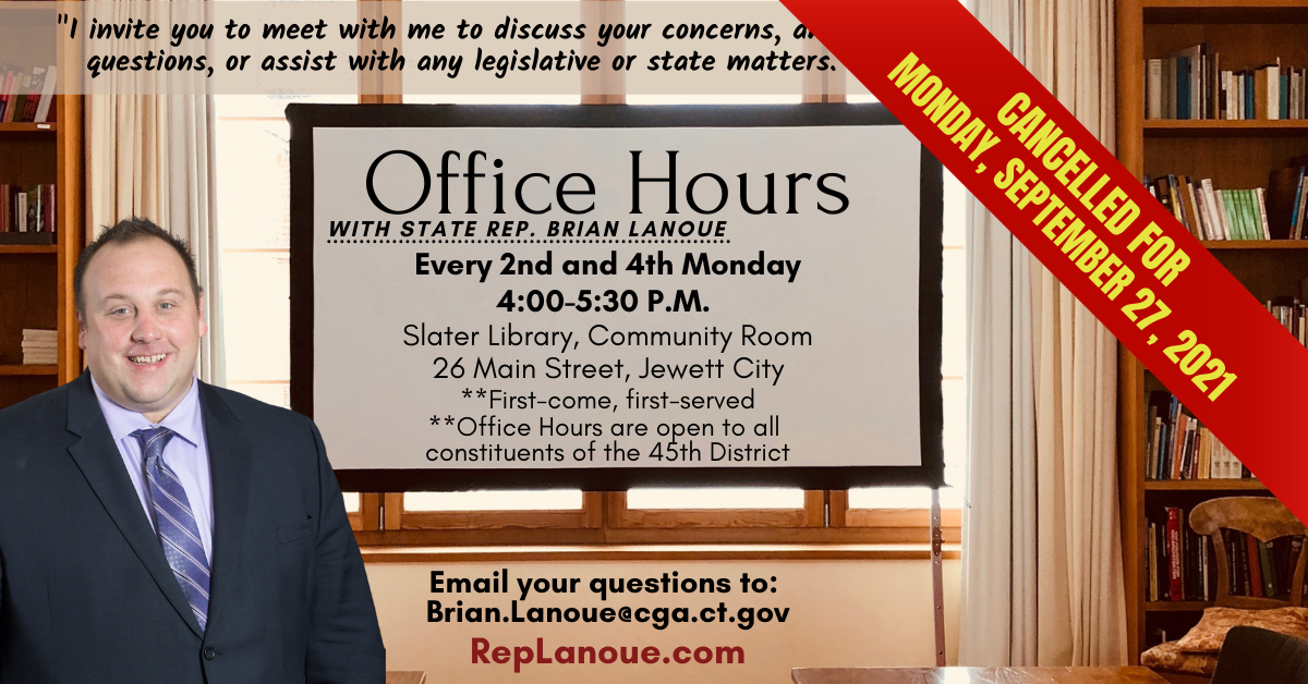 Due to the House of Representatives Special Session on Monday, September 27th, Office Hours will be cancelled.