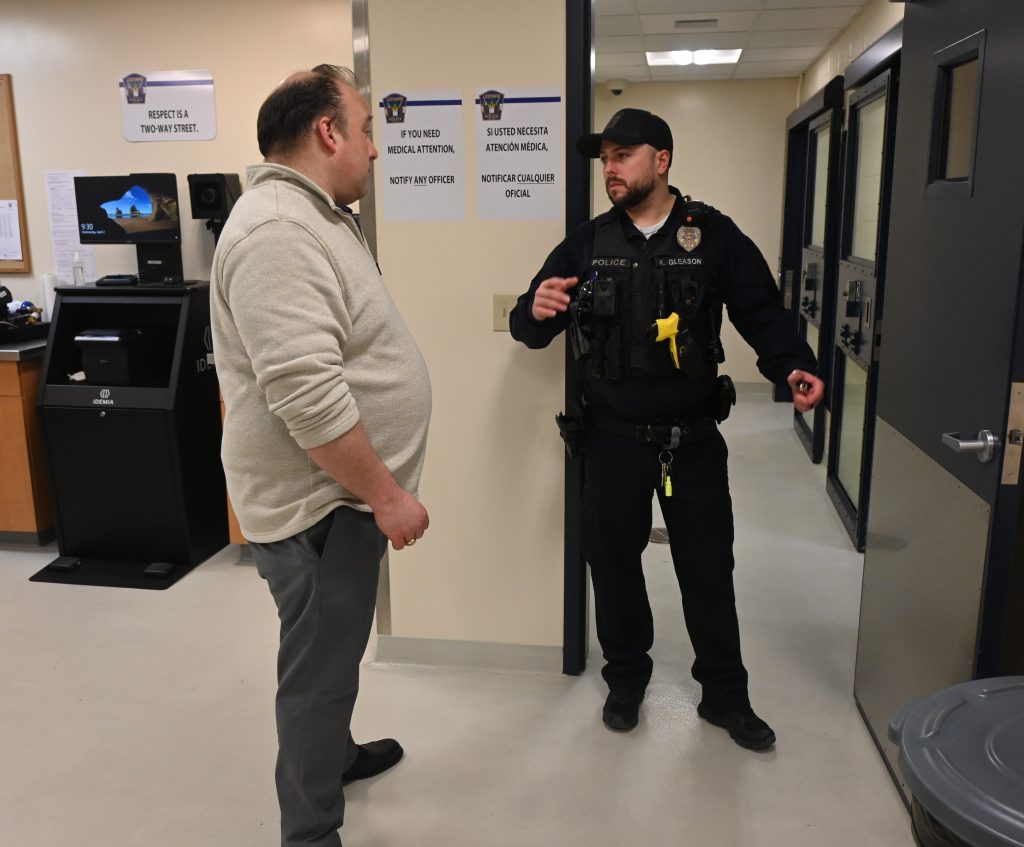 Officer Gleason then took me downstairs to show off their weight room and locker room facilities and then into the holding area where people who are arrested are processed. Not that you would want to find out firsthand, but even that part of the police station was well-maintained. The lock-up was impressive as it is very robust, and extremely secure. We ended the morning on a ride along where I was shown the driving routes, the neighborhoods and some of the priorities of the Police Department. I am thankful to everyone for showing me around and so impressed with how friendly everyone from the different neighborhoods were with the officers. It was great to see the positive relationships the police and Ledyard & Gales Ferry residents have with one another.