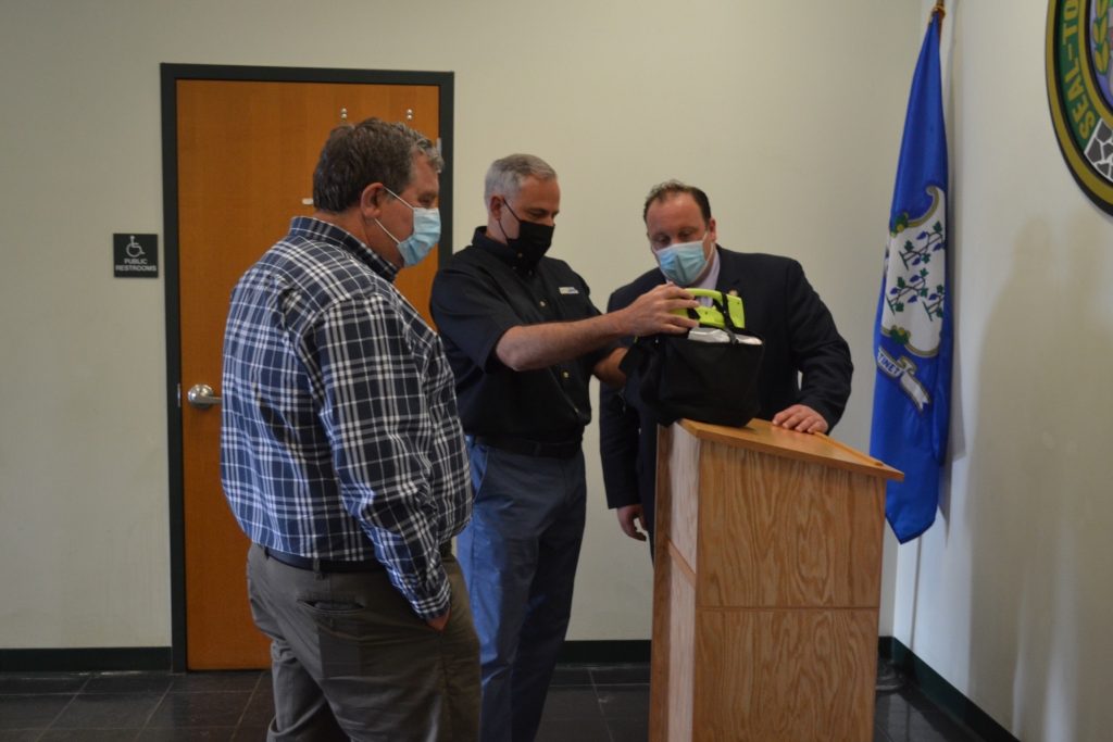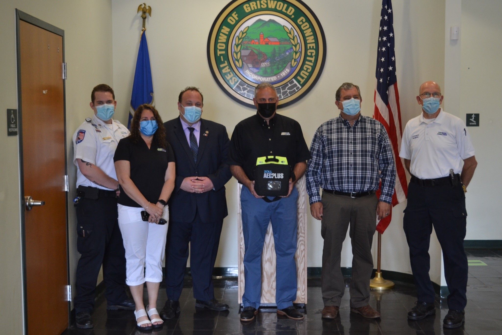 Monday morning at the Griswold Town Hall, I had the opportunity to join Griswold First Selectman Todd Babbitt, along with members from American Ambulance Service for their Automated External Defibrillator (AED) donation ceremony to the town. This dedication completes a team effort between the Town of Griswold and American Ambulance, that sponsored a CPR/AED certification program for town employees. This brings our first responders and town employees together in educating them on life-saving procedures in the work place. It was also announced that through efforts like this, the State of Connecticut Department of Public Health Emergency Services has designated Griswold a Heart Safe community.