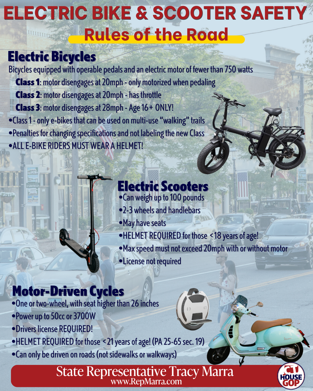 The increase in bike, e-bike, and e-scooter use and availability, along with unregulated or unlawful riding, is growing rapidly. Our emergency rooms are experiencing a significantly higher rate of ER visits from children on e-bikes and scooters. The Connecticut General Assembly has been working to update our laws to reflect the reality on our roads. We worked this session to clarify and catch up with the new technologies of these vehicles and to add safety laws, particularly for our young folks.
