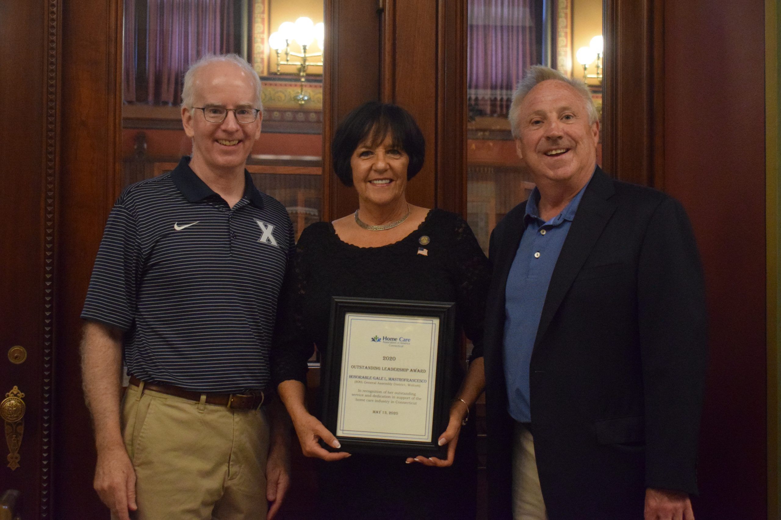 Photo Caption (l to r): Matthew Hallisey, HCAOA lobbyist; State Representative Gale Mastrofrancesco (R-80); and Mark McGoldrick, HCAOA Connecticut Chapter Chair and owner of Comfort Keepers present Rep. Mastrofrancesco with the 2020 Outstanding Leadership Award outside the House of Representatives Chamber at the Capitol Building in Hartford.