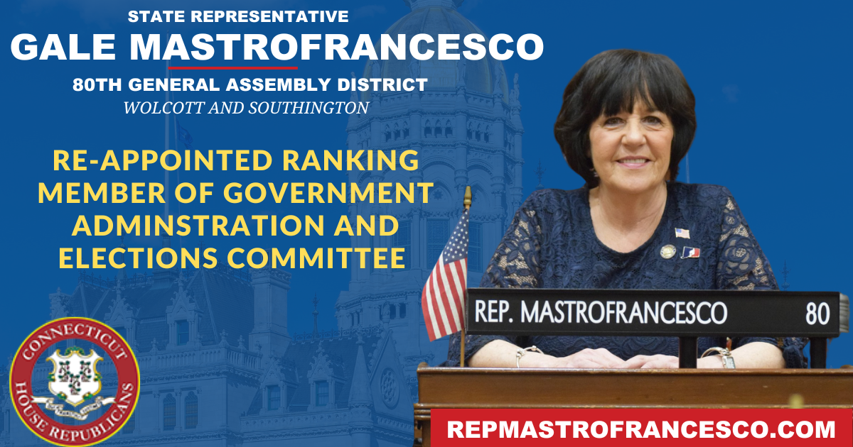 HARTFORD—House Minority Leader Vincent Candelora has re-appointed state Rep. Gale Mastrofrancesco, R-Wolcott, as the leading House Republican on the General Assembly’s Government Administration and Elections Committee.