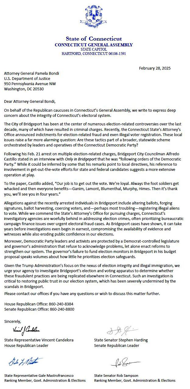 HARTFORD – Republican leaders in the Connecticut General Assembly have written to U.S. Attorney General Pamela Bondi today to formally request a federal investigation into whether election crimes in Bridgeport are part of a larger, coordinated effort to defraud voters statewide. (Letter is attached.)