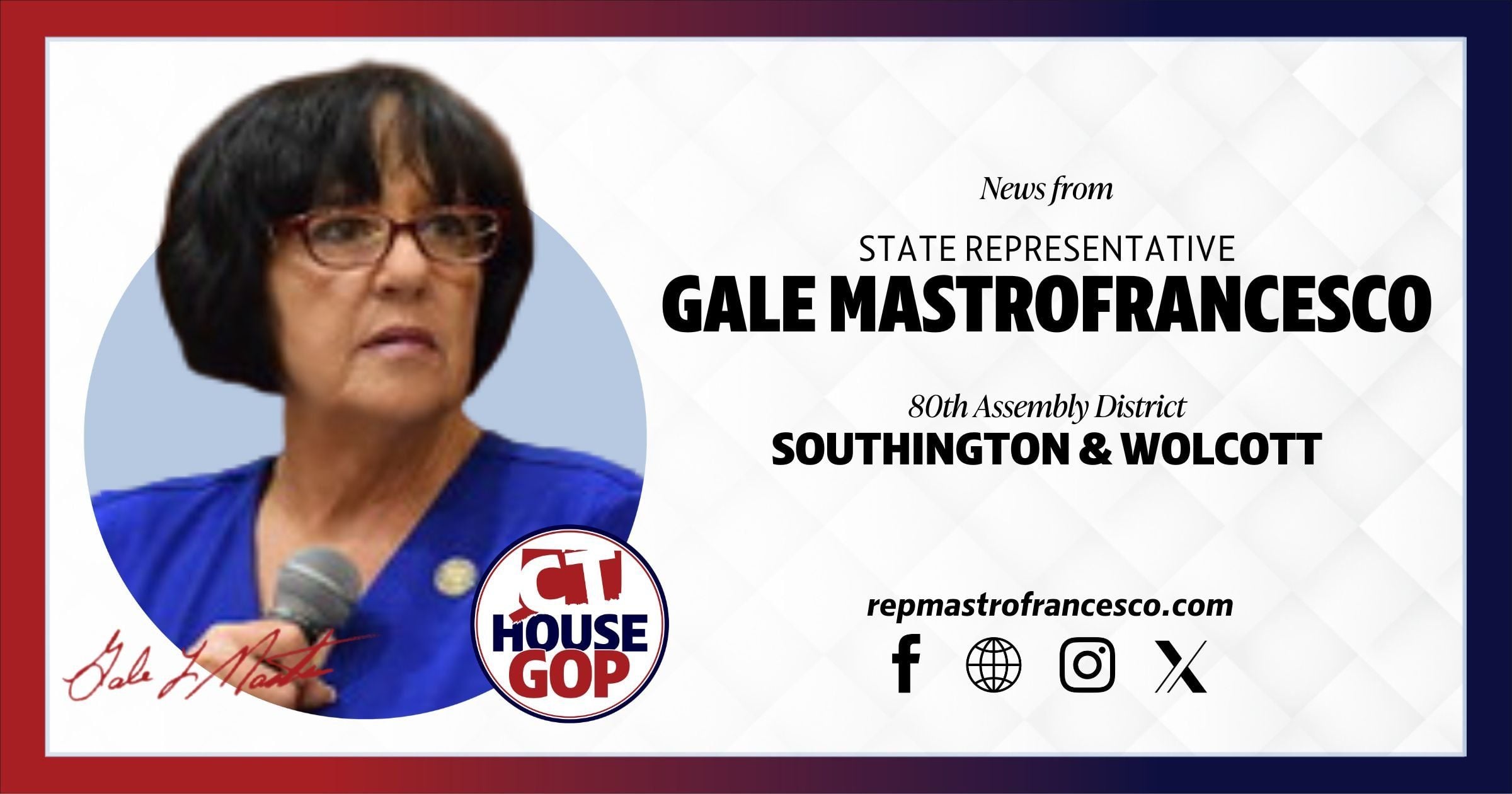 I can be reached by email at Gale.Mastrofrancesco@housegop.ct.gov or by phone at (800) 842-1423.