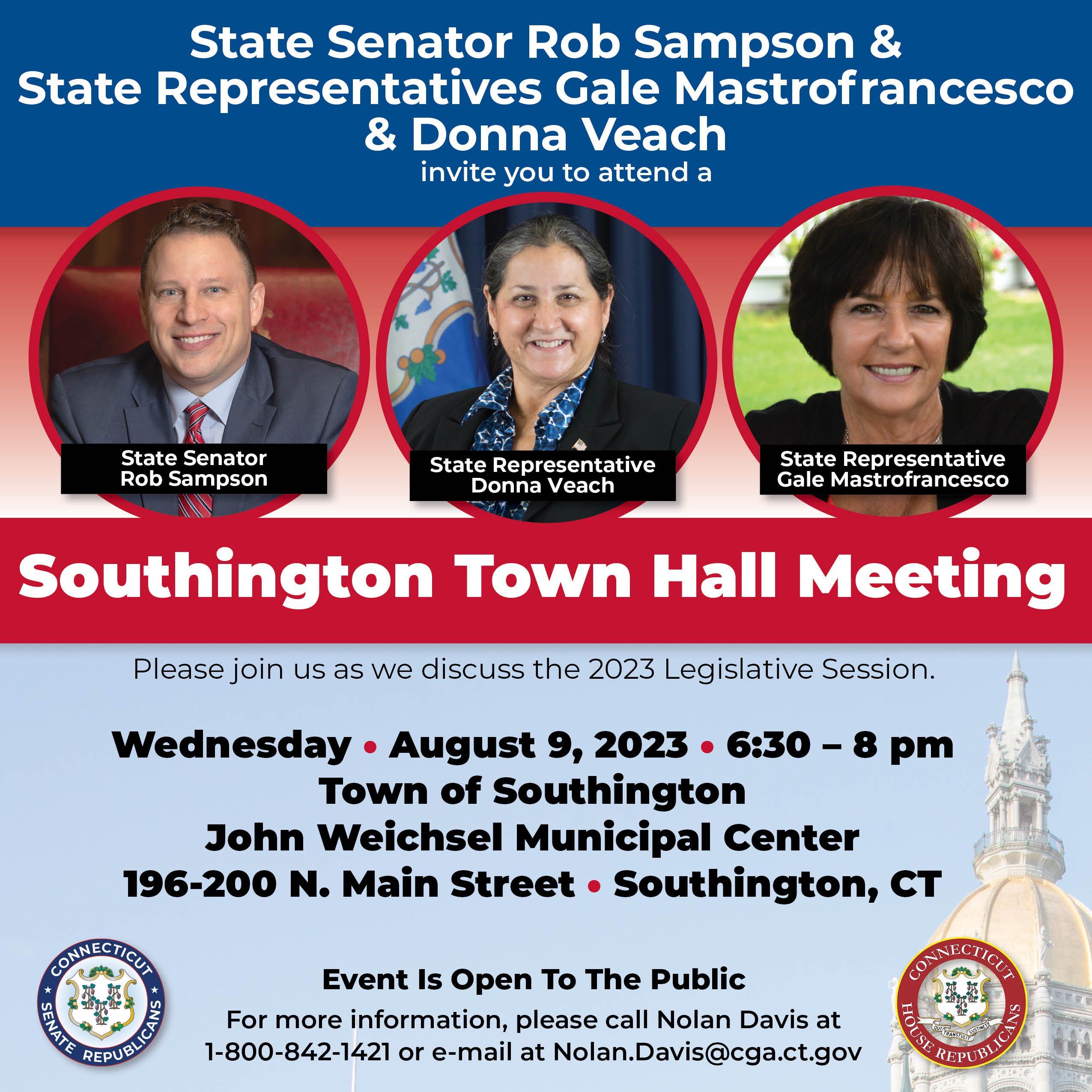SOUTHINGTON – State Representative Gale Mastrofrancesco (R-80th), Rep. Donna Veach ((R-30th) and State Sen. Rob Sampson (R-16th) will hold a Town Hall Meeting in Southington on Wednesday, Aug. 9, which is open to all residents. Now that the 2023 Legislative Session has concluded, the lawmakers want to hear your top concerns, give you an update about legislation that has passed and make you aware of government-related issues that are important to you.