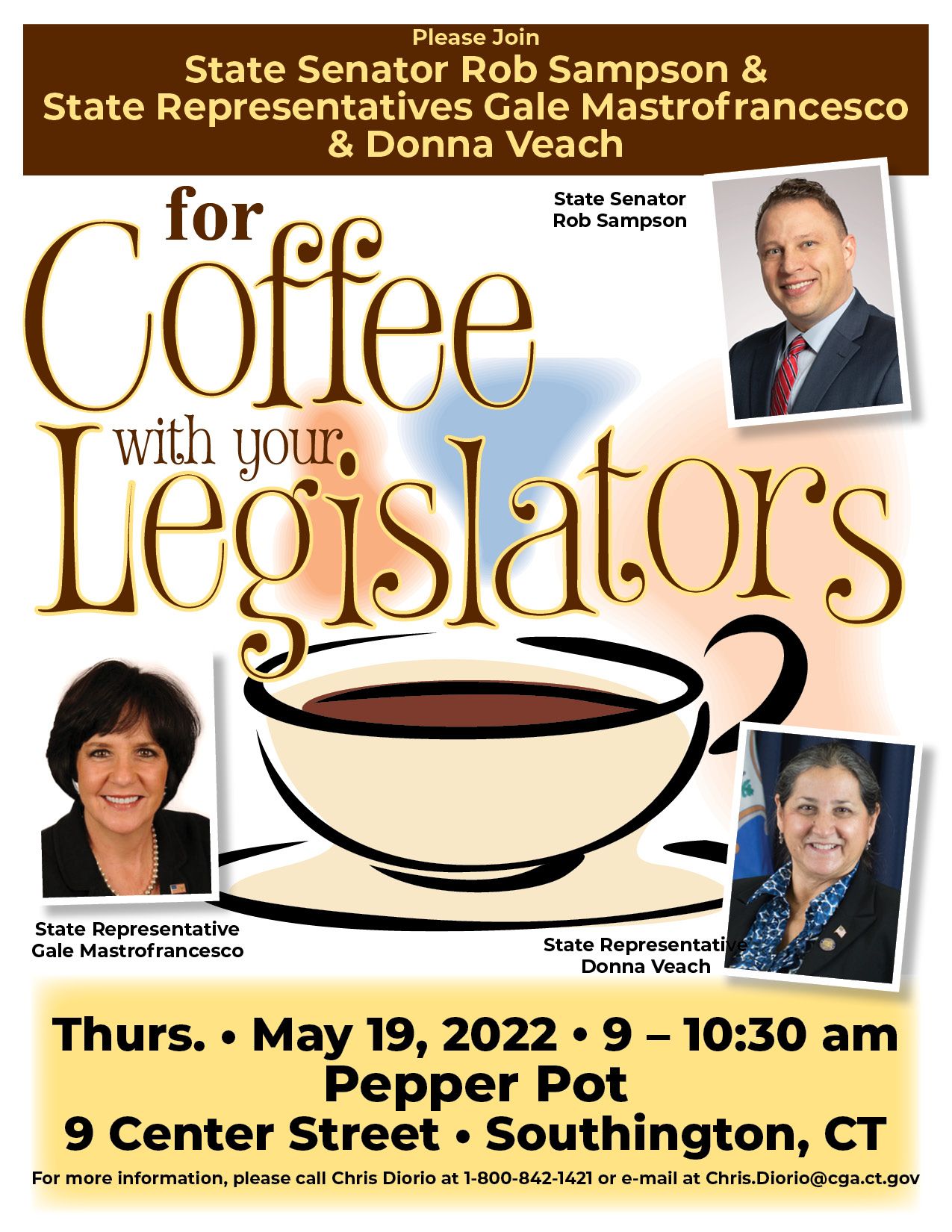 If you have any questions or are unable to attend but would still like to connect with Representative Mastrofrancesco and Veach please call (800) 842-1423 or (860) 240-8700 or Senator Sampson at 1-800-842-1421.