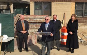 Rep. McGorty addresses the audience at the groundbreaking ceremony for renovations at the Sterling House in Stratford on Tuesday, February 21, 2017. Rep. Joe Gresko (D-121) Stratford Mayor John Harkins, and Rep. Laura Hoydick (R-121) are behind him.