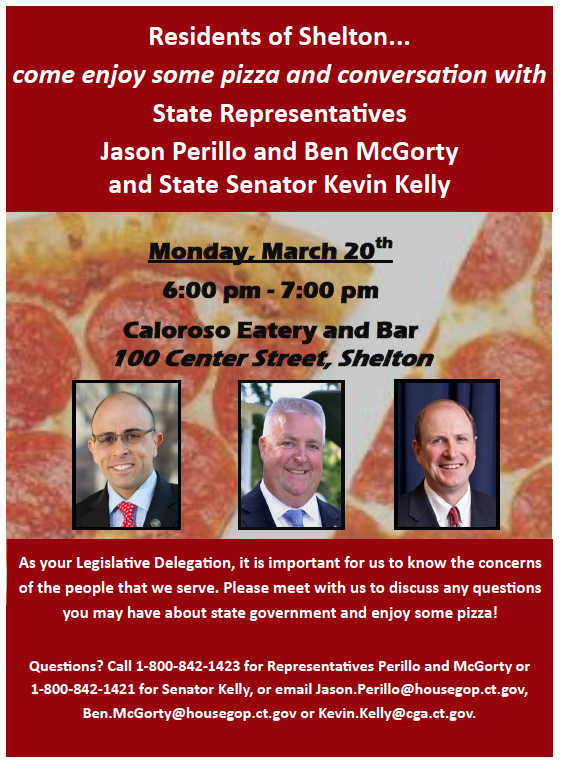 State Representatives Ben McGorty, Jason Perillo and State Senator Kevin Kelly are hosting a pizza-and-conversation event to meet with residents and answer questions about state government.
