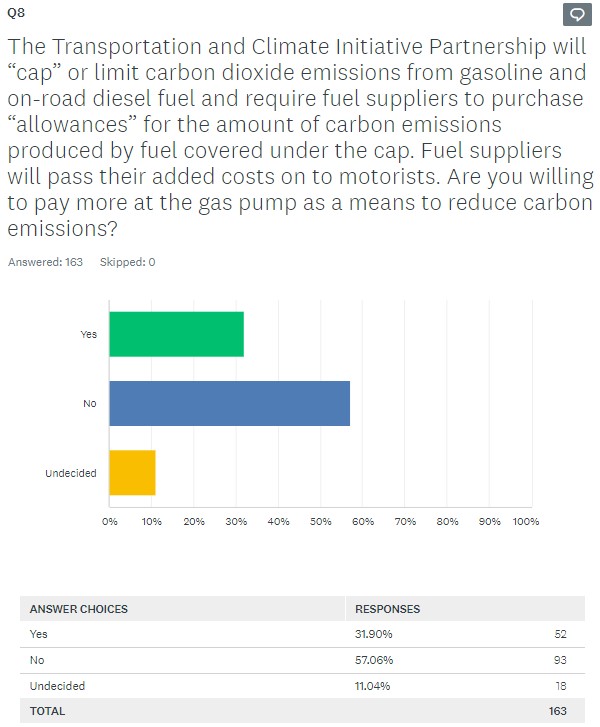 Q8 The Transportation and Climate Initiative Partnership will “cap” or limit carbon dioxide emissions from gasoline and on-road diesel fuel and require fuel suppliers to purchase “allowances” for the amount of carbon emissions produced by fuel covered under the cap. Fuel suppliers will pass their added costs on to motorists. Are you willing to pay more at the gas pump as a means to reduce carbon emissions?