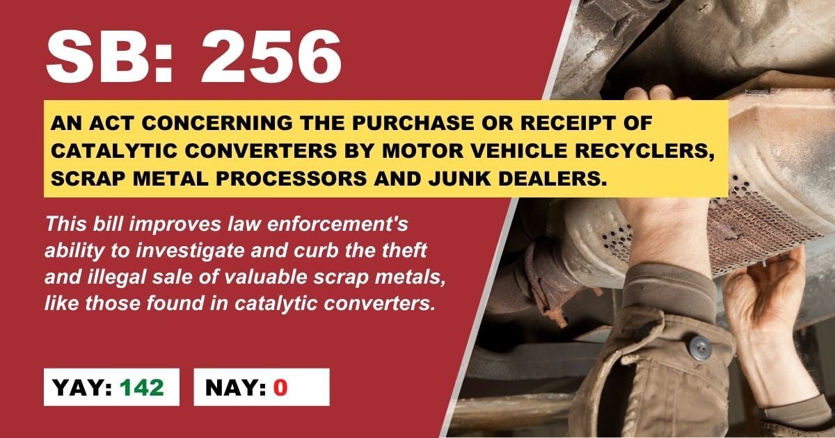 The bill generally prohibits motor vehicle recyclers from receiving a catalytic converter unless it is attached to the motor vehicle and prohibits selling a catalytic converter unless it’s affixed or they write a stock number on it. Additionally, the legislation prohibits anyone other than a recycler or motor vehicle repair shop from selling more than one unattached converter to a scrap metal processor, junk yard, or junk dealer in a day. Record keeping requirements are also expanded under this legislation.