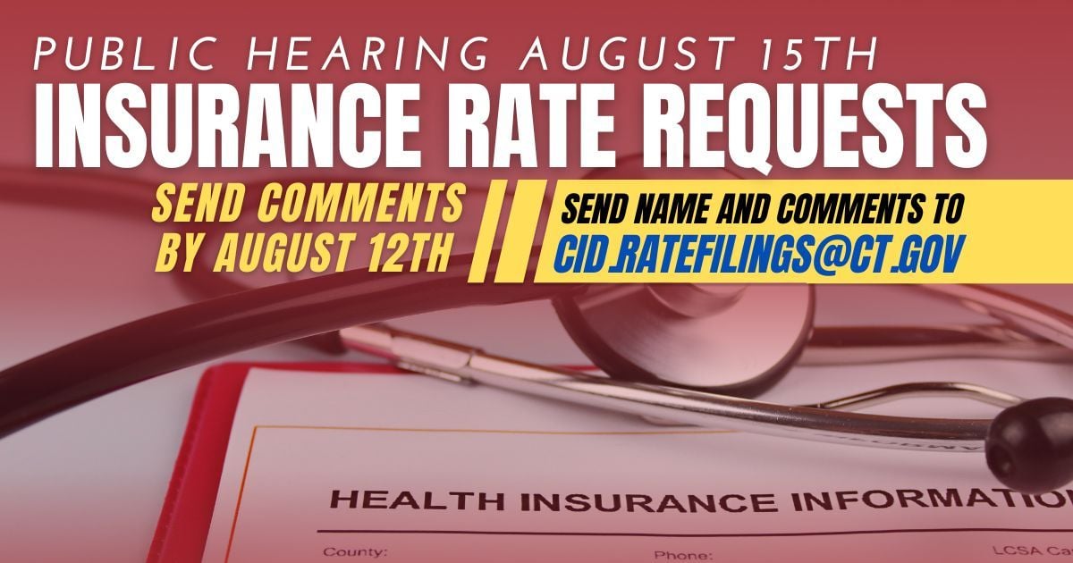 The public will have an opportunity to submit questions and/or provide comments specific to the rate filings. Anyone wishing to speak virtually at the meeting via Zoom can sign up by sending an email to cid.RateFIlings@ct.gov with your name and written comments attached no later than Friday, August 12, 2022. Anyone who wants to speak in person can sign up on the morning of August 15 at the Legislative Office Building beginning at 8:30AM.