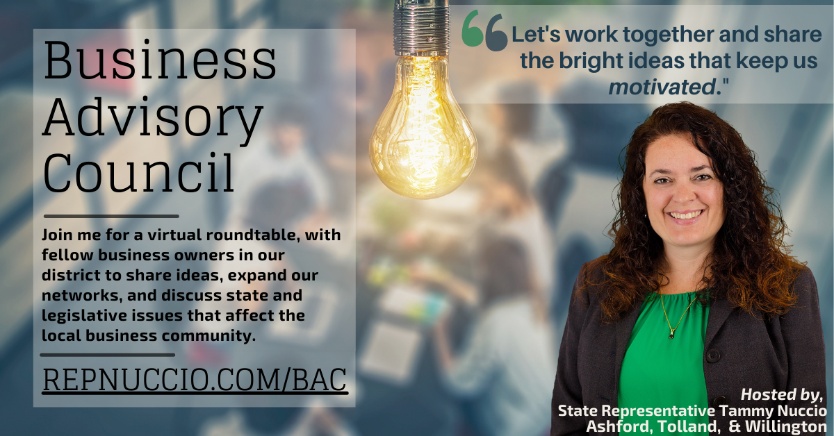 State Rep. Tammy Nuccio will be hosting Business Advisory Council meetings throughout 2022. The meetings will take place on the fourth Friday of every quarter. The first meeting of 2022 will be held on Friday, January 28, from 7:00 a.m. – 8:00 a.m. via Zoom.
