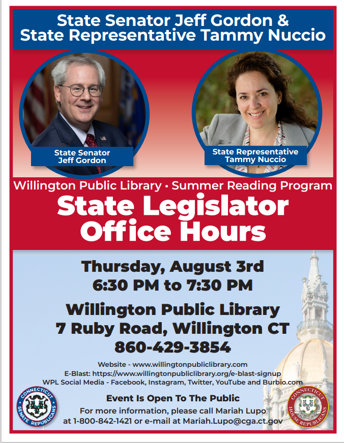 WILLINGTON – Rep. Tammy Nuccio, R-53rd, will join Sen. Jeff Gordon for open office hours at the Willington Public Library, which will be open to all residents. With the conclusion of the session, the event is an opportunity for residents to speak with Rep. Nuccio and Sen. Gordon about legislation that passed, including the state’s budget, answer any questions they may have about state government, or discuss any other items that may affect them.