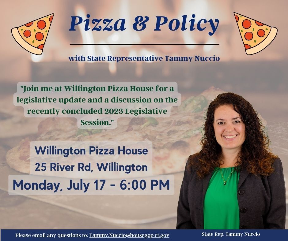 HARTFORD – Rep. Tammy Nuccio, R-53rd, will host a Pizza & Policy event in Willington to discuss the 2023 legislative session with residents.