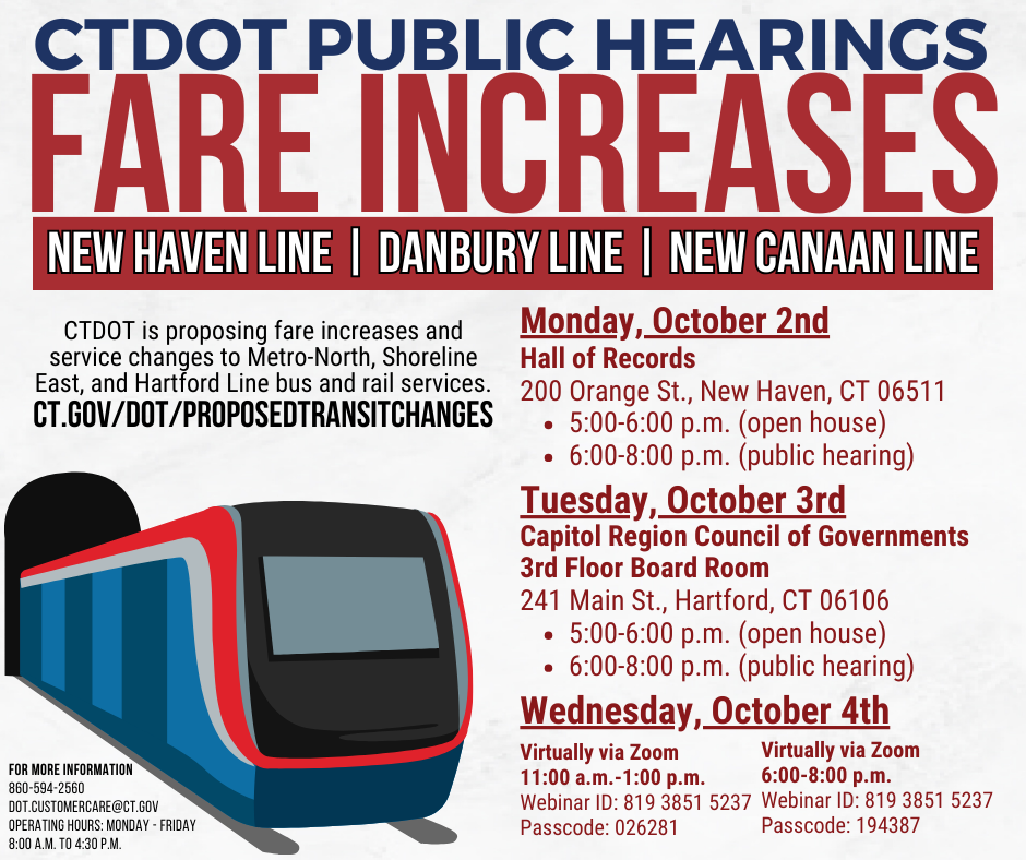 The Connecticut Department of Transportation (CTDOT) announced a series of four public hearings to gather input on the proposed rail and bus service changes, as well as proposed rail fare increases.