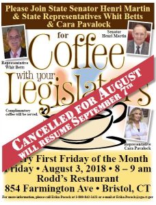 Bristol – State Reps. Whit Betts (R-78) and Cara Pavalock D’Amato (R-77), and State Sen. Henri Martin (R-31) have announced that their monthly Coffee Hour event for August at Rodd’s Restaurant (854 Farmington Ave., Bristol) is cancelled.