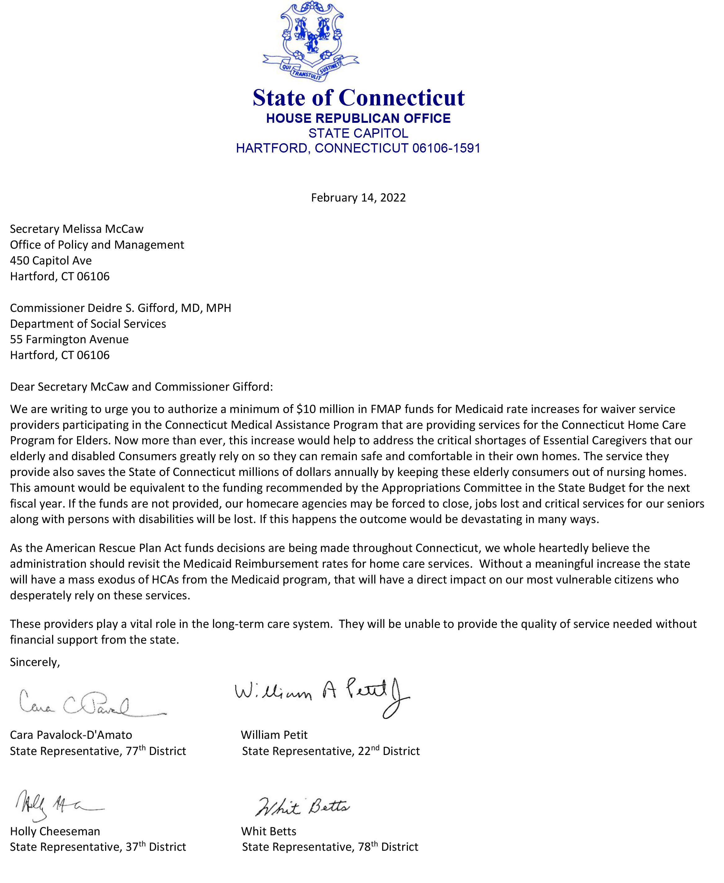HARTFORD – In an effort to bring more attention to the financial need of the Connecticut Home Care Program for Elders, State Representatives Cara Pavalock-D’Amato (R-Bristol), William A. Petit Jr. (R-Plainville), Whit Betts (R-Bristol), and Holly Cheeseman (R-East Lyme) submitted a request to DSS Commissioner, Deidre S. Gifford, and OPM Secretary, Melissa McCaw, to assist Essential Caregivers by closing a gap in their reimbursement.