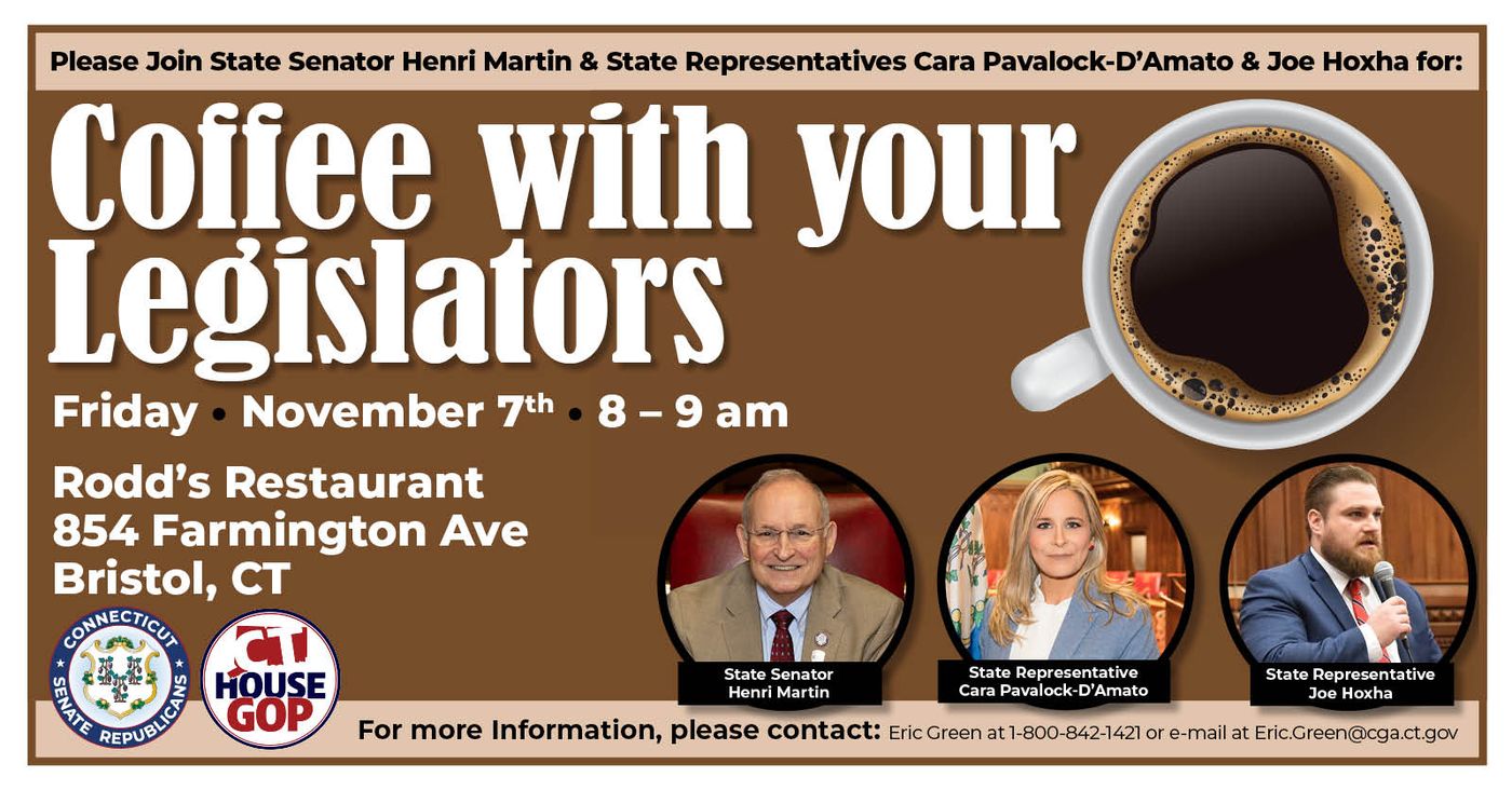 Senator Henri Martin, Representative Joe Hoxha and I will be holding our monthly coffee hour on Friday, November 7th at 8:00 a.m.