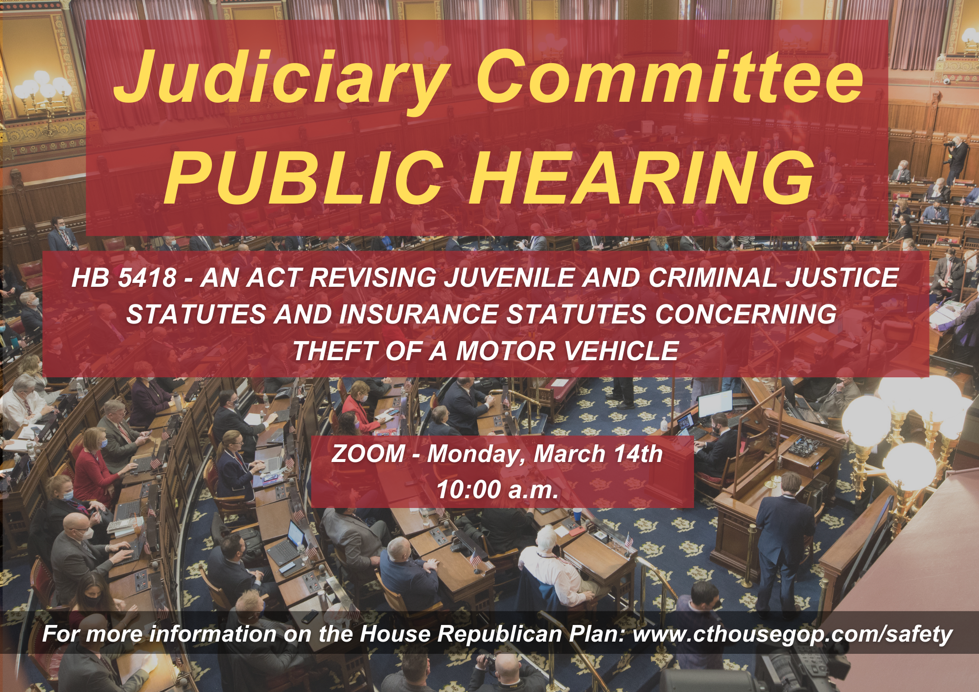 The Judiciary Committee will hold a public hearing on Monday, March 14, 2022 at 10:00 A.M. via Zoom. The public hearing can be viewed via YouTubeLive.