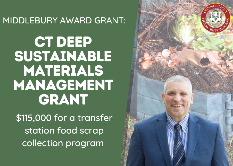 Hartford—State Representative Bill Pizzuto (R-71) is applauding a $115,000 grant awarded to the Town of Middlebury from the Connecticut Department of Energy and Environmental Protection’s Sustainable Materials Management (SMM) Grant program. Middlebury, Bethel, and Kent will be joining 15 other municipalities, including Newtown, to implement innovative pilot programs to collect residential food scraps and reduce trash and collect food scraps.