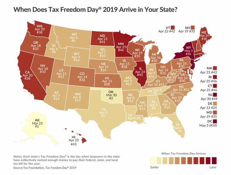 This year, according to The Tax Foundation, Connecticut’s Tax Freedom Day is April 25, which means we’re tied for 46th place with Minnesota and Rhode Island. Only New York, New Jersey and Washington D.C. residents have to pay more to cover their obligations.