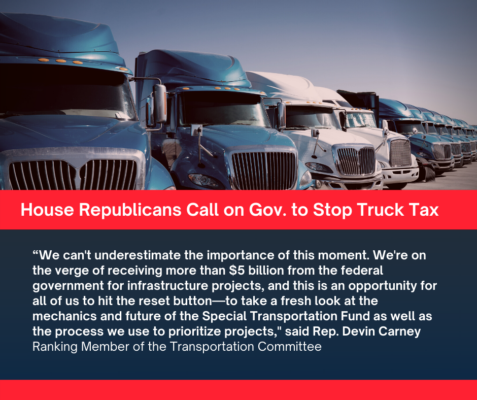 House Republicans on Wednesday, November 17, 2021, called for Gov. Lamont to stop implementation of the truck tax, contending the confluence of substantial federal infrastructure aid and the controversial revenue policy that will increase costs for businesses and residents should have state lawmakers redefining a path forward on improving our transportation grid.