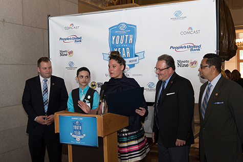 State Reps. Joe Polletta, Tony D’Amelio, Stephanie Cummings and Geraldo Reyes were able to break away from voting in the House of Representatives Wednesday evening to honor Boys & Girls Club of Greater Waterbury 2017 Youth of the Year Danny Ruiz.