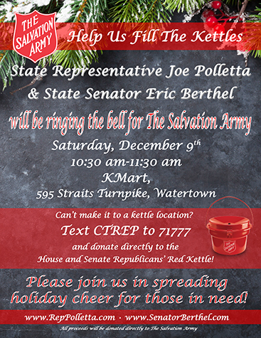 The legislators welcome all constituents to stop by the store and help make the fundraising event a success! If you are unable to make it on December 9th, you can text “CTREP” to 71777 to donate directly to the House and Senate Republicans’ Red Kettle. You can also visit the Salvation Army’s website at www.salvationarmyusa.org to learn of other ways to do good this holiday season; for example, by donating cars, clothing, household goods, airline miles, bonds and stocks, or volunteering for the community.