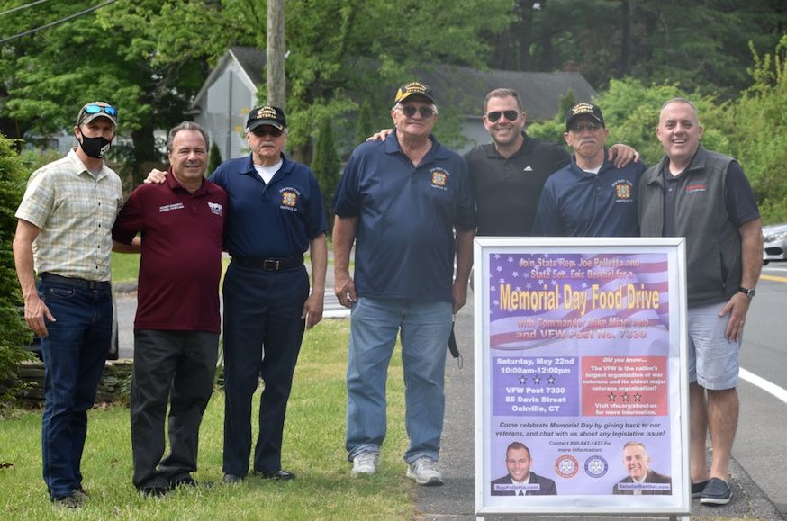 (l to r): TJ Oneglia, Rich DiFederico, Senior Vice Commander Erich Ruman, Joe Ostroski, State Representative Joe Polletta, Commander Mike Minervino and State Senator Eric Berthel gathered outside of VFW Post No. 7330 in Oakville on Saturday, May 22, 2021 during a Memorial Day Food Drive hosted by the legislators, VFW Post No. 7330, and Commander Mike Minervino.