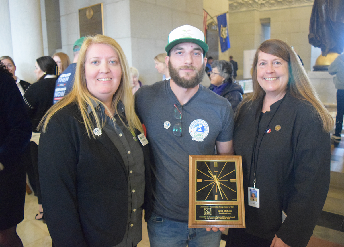 PHOTO (from left to right): Amanda Fargo-Johnson, Agriculture Programs Director for the Connecticut Resource Conservation & Development Area, Jared McCool, Connecticut’s Outstanding Young Farmer award recipient, and State Representative Karen Reddington-Hughes (R-66).