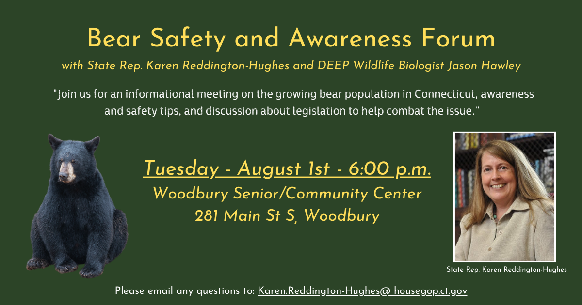In response to several local and statewide human-bear interactions, State Representative Karen Reddington-Hughes (R-66), announced she is hosting a Bear Safety and Awareness Forum with Department of Energy and Environmental Protection Wildlife Biologist Jason Hawley.