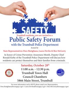 HARTFORD- State Reps. David Rutigliano (R-123), Laura Devlin (R-134) and Ben McGorty (R-123) along with the Trumbull Police Department are inviting all Trumbull residents to a Town-Wide Public Safety Forum.