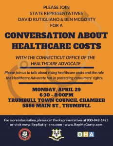 TRUMBULL- State Representatives David Rutigliano (R-123) and Ben McGorty (R-122) are inviting Trumbull constituents to a Forum with the Office of the Healthcare Advocate on ways for residents to potentially save on their healthcare plans.