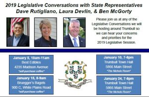 TRUMBULL- Trumbull State Reps. David Rutigliano (R-123), Laura Devlin (R-134) and Ben McGorty (R-122) will be hosting four separate ‘Legislative Listening Sessions’ over the coming weeks. The listening sessions are free and all Trumbull residents are encouraged to attend.