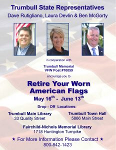 Trumbull legislators, Rep. David Rutigliano, Rep. Laura Devlin and Rep. Ben McGorty, in conjunction with the Trumbull Memorial VFW Post #10059 are providing three locations that residents can drop off their worn American flags for proper ceremonial disposal according to the U.S. Flag Code. Drop-off locations will receive flags from May 16th – June 13th.