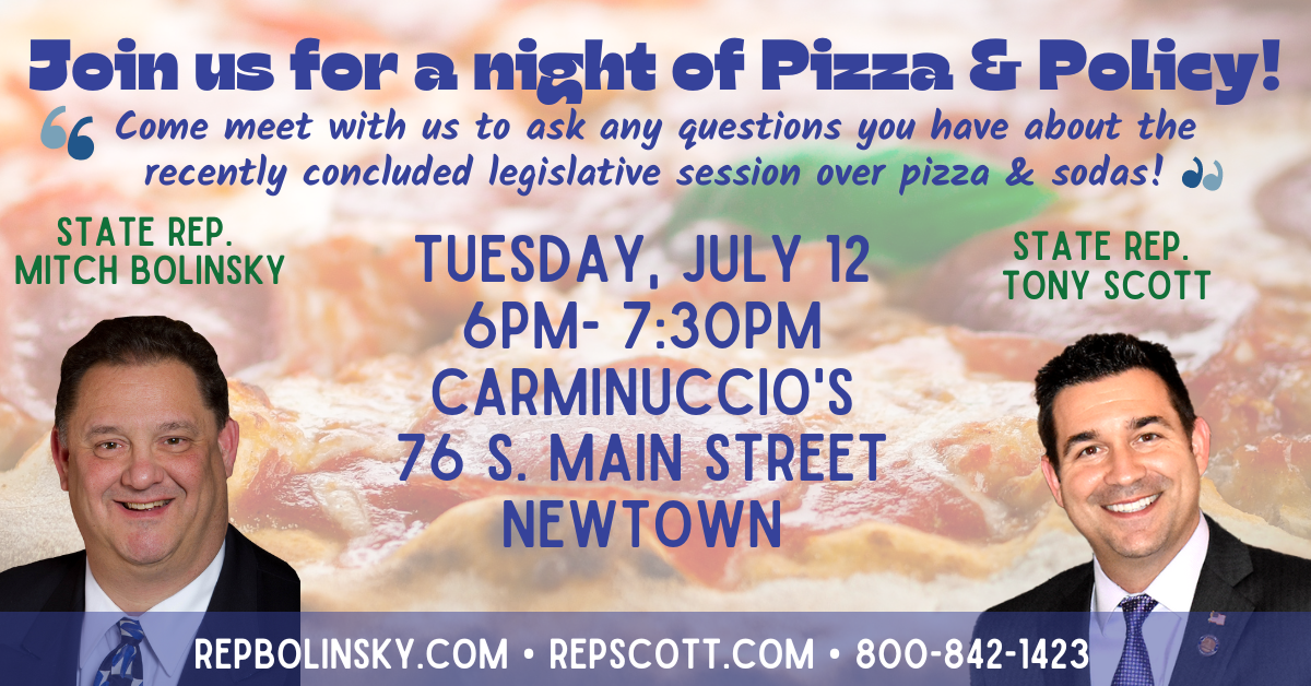 NEWTOWN – State Reps. Mitch Bolinsky (R-106) and Tony Scott (R-112) will be hosting a legislative review at Carminuccio’s Pizza, on the patio at 76 South Main Street in Newtown on Tuesday, July 12th from 6:00 pm to 7:30 pm. The event is open to the public.