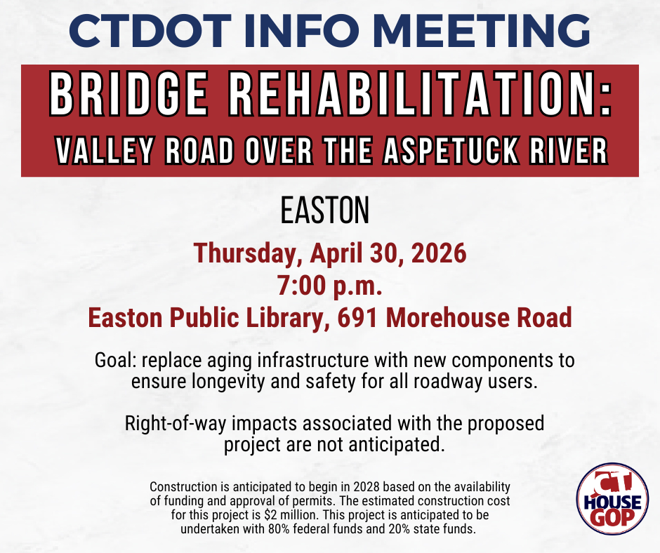 The CT Department of Transportation will be holding an in-person public information meeting about the rehabilitation of the bridge carrying Valley Road over the Aspetuck River in Easton on Thursday, April 30, 2026, at 7:00 p.m. at the Easton Public Library (691 Morehouse Road). A Q&A session will immediately follow the presentation.