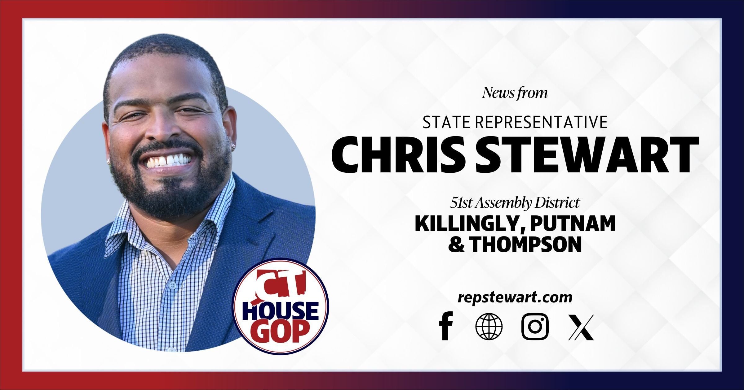 State Representative Chris Stewart was elected to his first term in the Connecticut General Assembly in November of 2024, and represents the 51st General Assembly District including the towns of Killingly, Putnam, and Thompson. Rep. Stewart will serve on the Education, Environment, and Human Services Committees for the 2025 and 2026 Connecticut Legislative Sessions.
