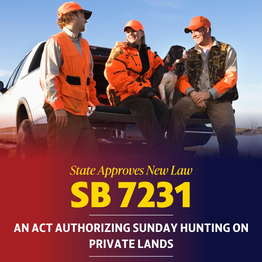 The passage of SB-7231 is great news for families who were previously unable to hunt together due to scheduling conflicts. This expansion which takes effect October 1, will now provide them with an opportunity to do so on Sunday. The law maintains hunting must take place on private lands over 10 acres and not within 40 yards of public trails. It also excludes hunting migratory birds.