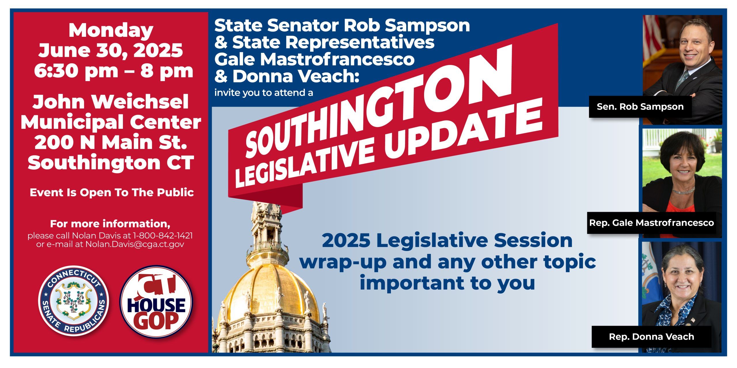 HARTFORD – Following the conclusion of the 2025 Legislative Session earlier this month, State Representatives Donna Veach (R-Berlin), Gale Mastrofrancesco (R-Wolcott) and State Senator Rob Sampson (R-Wolcott) are inviting area residents to join them for a post-session legislative update.