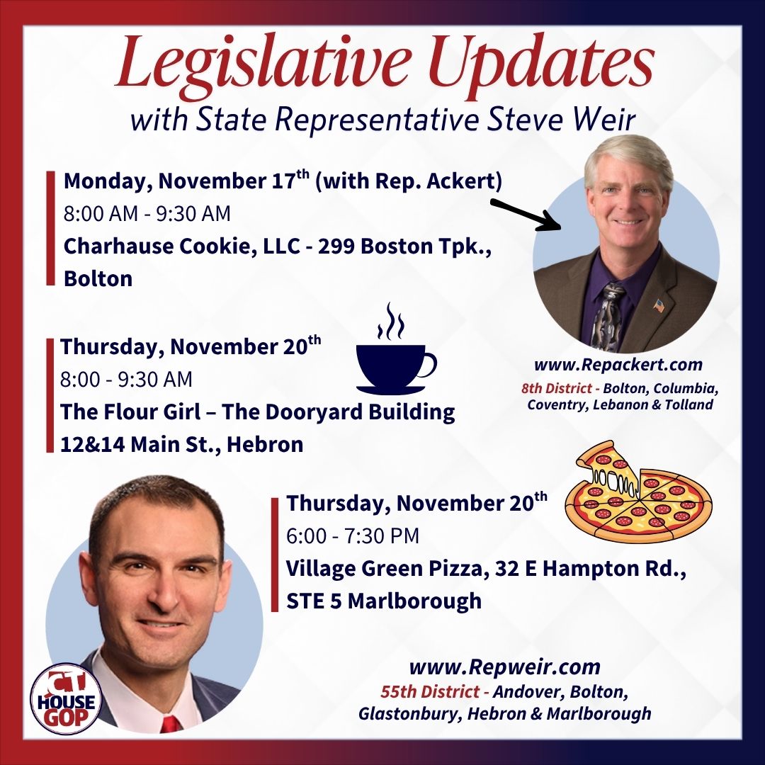 Rep. Weir to Host Legislative Updates in Bolton, Hebron, and Marlborough