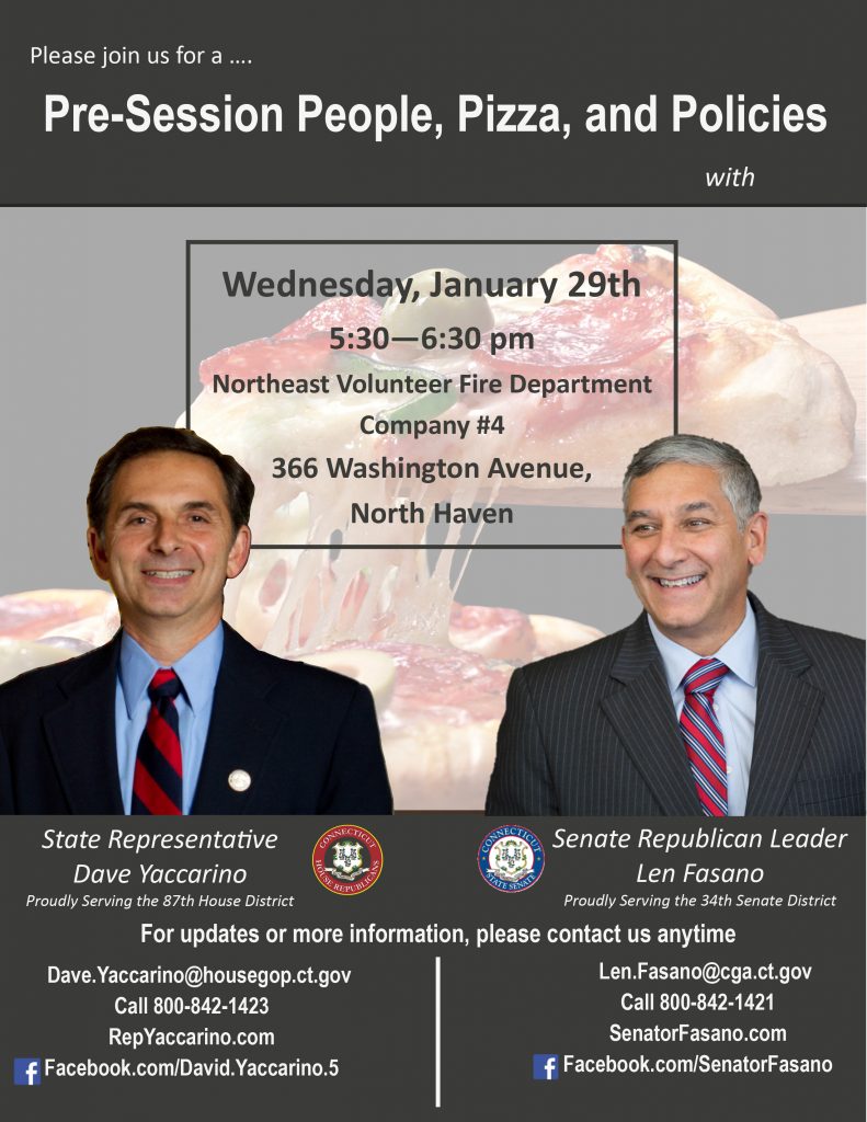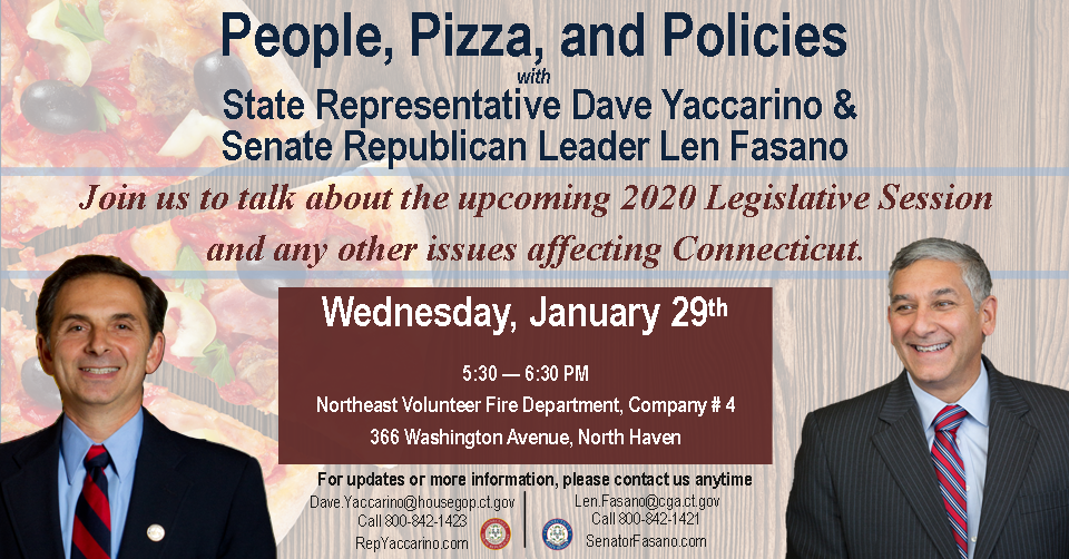 State Rep. Dave Yaccarino (R-87) and (R-77), and Senate Republican Leader Len Fasano (R-34) have announced that they will be hosting a People, Pizza and Policies event on Wednesday, January 29, 2020 from 5:30-6:30 p.m. at Northeast Volunteer Fire Department, Company #4, located at 366 Washington Avenue in North Haven.