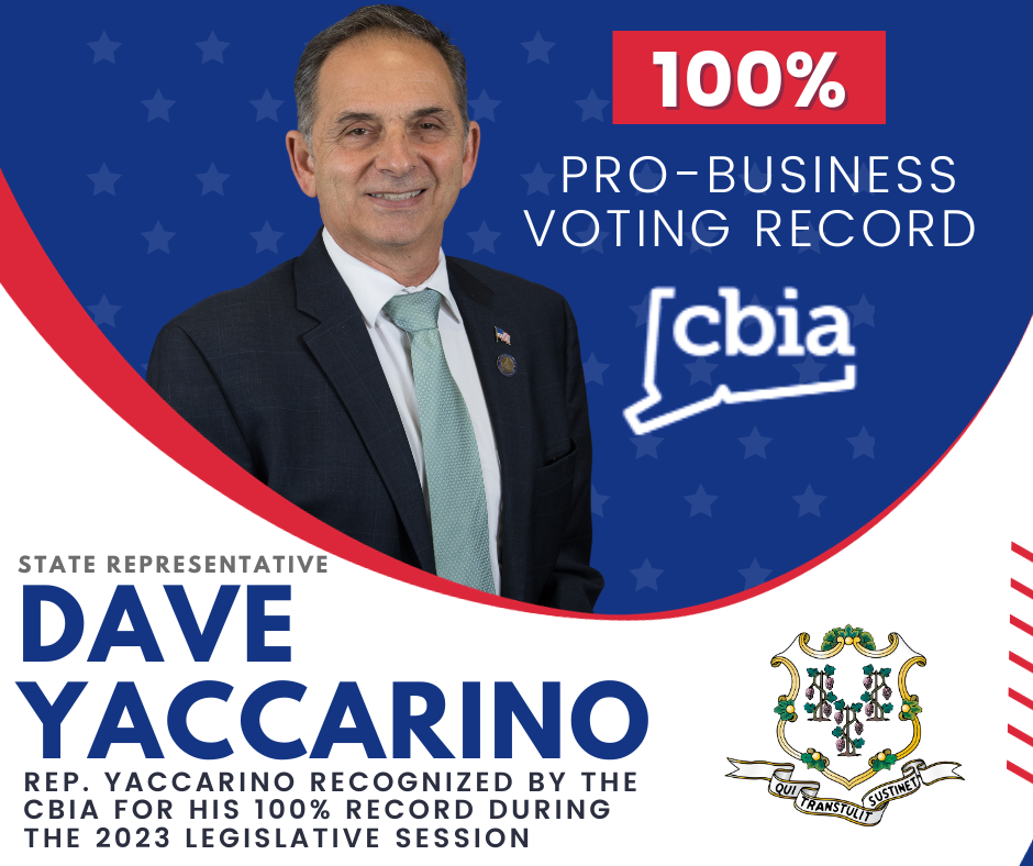 Connecticut’s largest business organization recognized State Representative Dave Yaccarino with a perfect voting score on key bills impacting Connecticut’s economic growth and business climate during the 2023 legislative session.