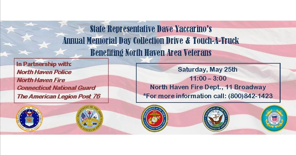 State Representative Dave Yaccarino (R-87), in conjunction with Connecticut National Guard, North Haven Police Department, North Haven Fire Department and American Legion Post 76 is hosting an annual Memorial Day Collection Drive and Touch-A-Truck to collect items to benefit area veterans in need.