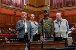 At the start of a legislative session day in the House of Representatives, State Rep. Zawistowski introduced Lindsey Vigue, Executive Director of Donate Life CT, liver recipient Kevin Prue, and 15-year heart transplant recipient Dennis Thomas to the chamber.