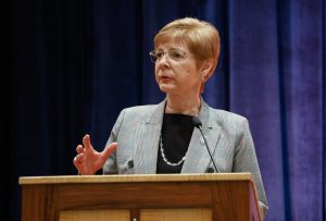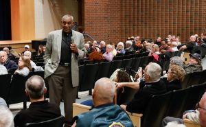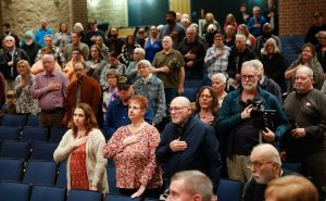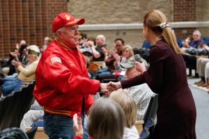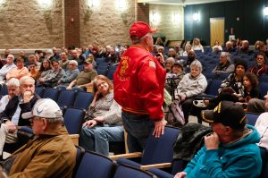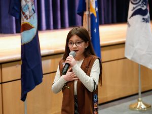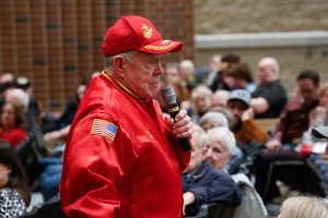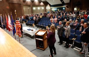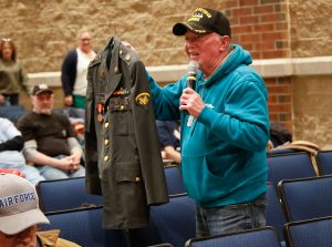 The nearly two-hour event began with the National Anthem performed by Traci Mnich, followed by the Pledge of Allegiance led by Girl Scout Carrigan Boucher. It also featured brief remarks from the elected officials before Lieutenant Governor Bysiewicz carried a microphone around the auditorium for the veterans to tell their stories and talk about their experiences.