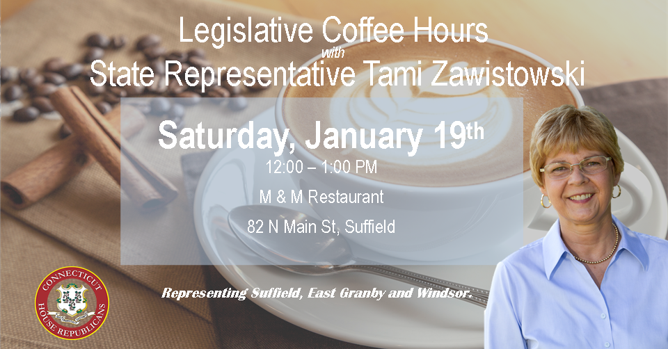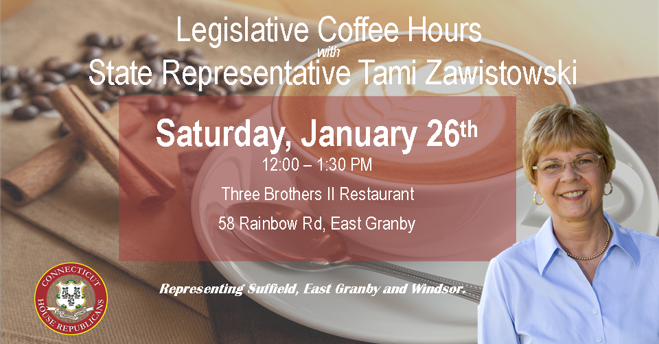 Please join me on Saturday January 19th 12:00 pm – 1:00 pm at M&M Restaurant (82 N. Main Street, Suffield) and Saturday, January 26th 12:00 pm – 1:30 pm at Three Brothers II (58 Rainbow Road, East Granby) for Legislative Coffee Hours. As your legislator, it is very important for me to know your concerns. Join me to discuss the budget and other legislative issues or questions you may have related to state government!