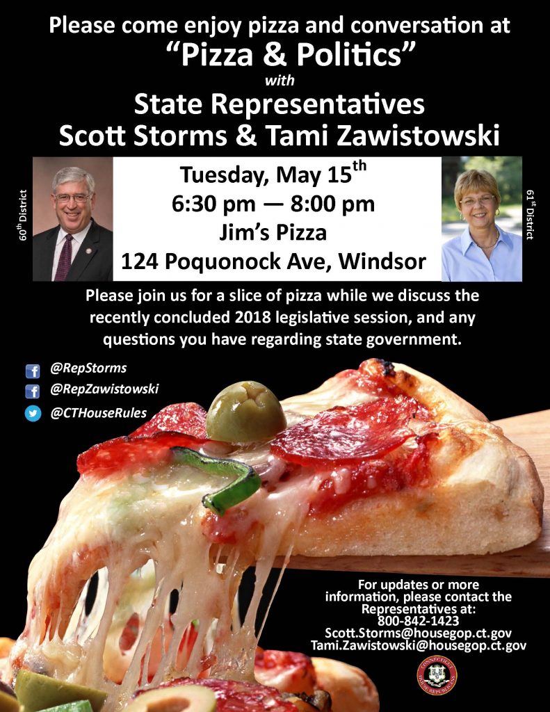 Please join me on Tuesday, May 15th 6:30pm – 8:00pm at Jim’s Pizza (124 Poquonock Ave, Windsor) for Pizza and Politics. As your legislator, it is very important for me to know your concerns. Please join me to discuss the budget and other legislative issues or questions you may have related to state government!
