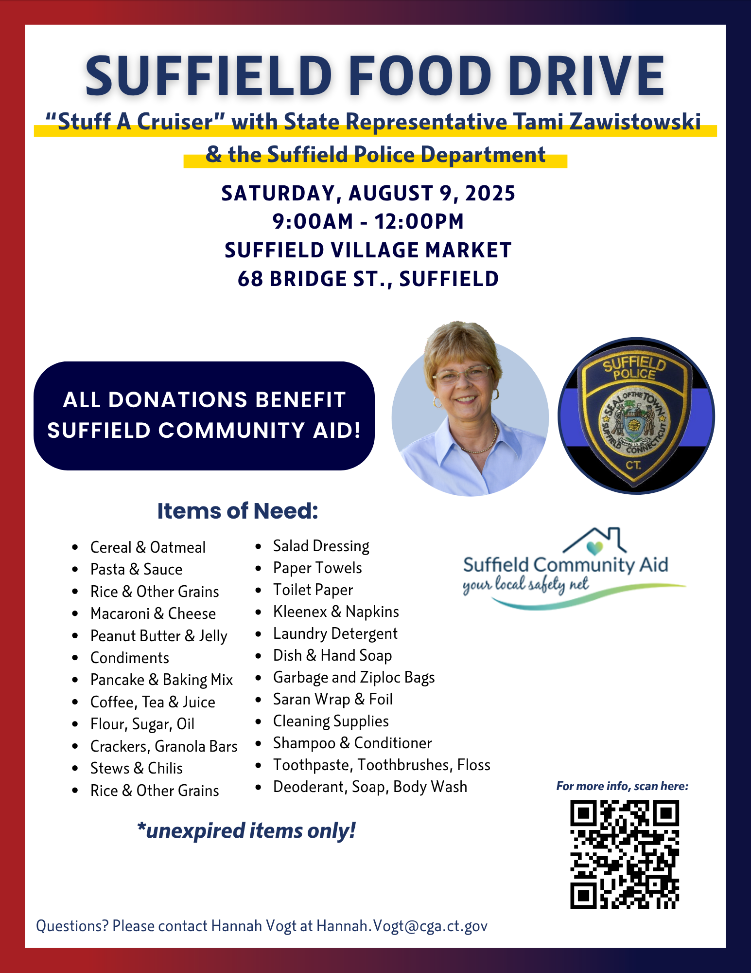 “Suffield Community Aid always works so hard to help others and I’m excited to partner with the Suffield Police again to collect much-needed food and supplies to further their mission,” Rep. Zawistowski said.